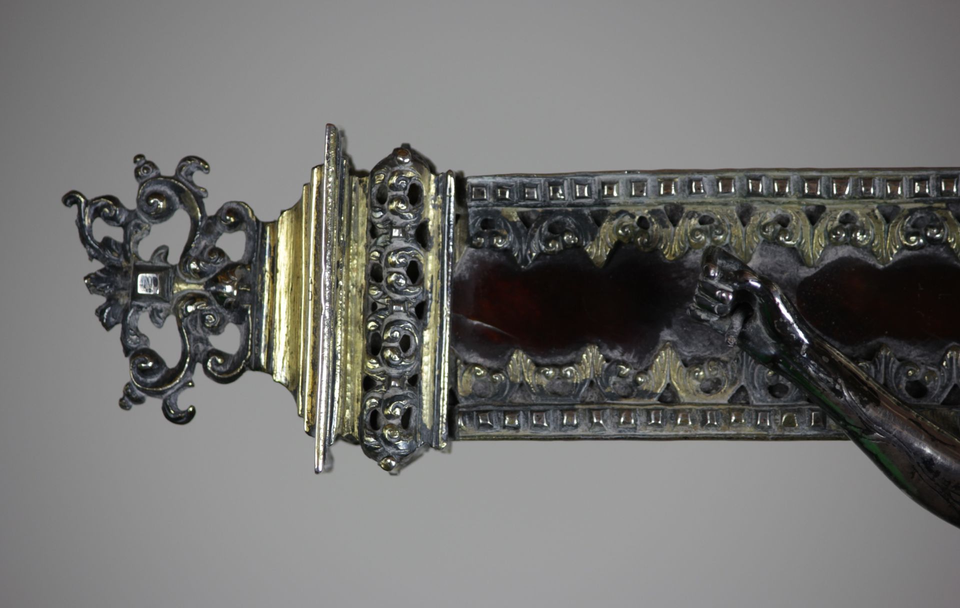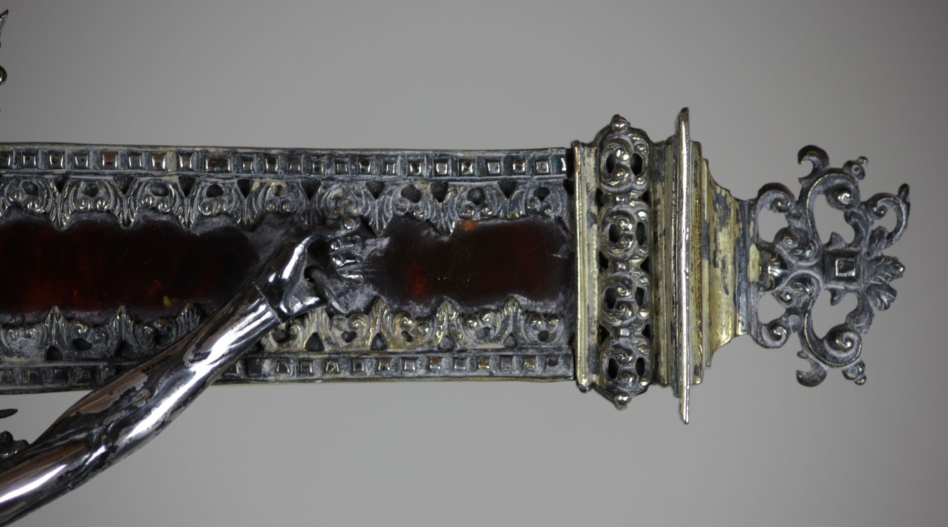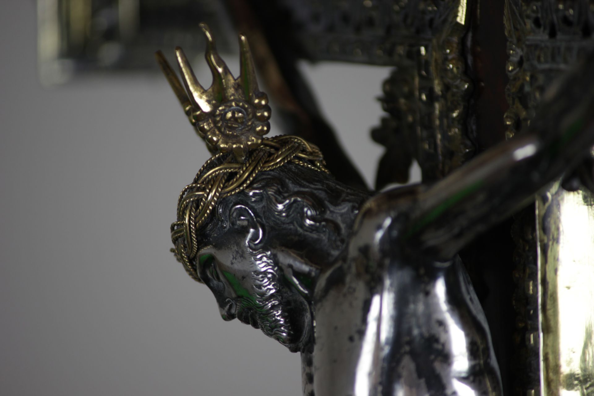 In this depiction of Cristo Morto (dead Christ), the beautifully proportioned body is unmarked, conveying the idea that Jesus' suffering was not only physical but also spiritual, as he took on the sins of humanity. The crucifixion is portrayed with intense agony and exhaustion, evoking feelings of compassion, gratitude, and awe in the viewer. The Saviour hangs from a gilded silver and tortoiseshell inlaid cross, with a titulus inscribed in Latin, ‘Iesvs Nazarenvs Rex Ivdeorvm’ (Jesus of Nazareth, the King of the Jews) placed above him. At the base of the cross, a silver skull is positioned, symbolising the place where Jesus was crucified, referred to as "Golgotha" or the "place of the skull". This skull is also known as the "Calvary skull" or "Golgotha skull."