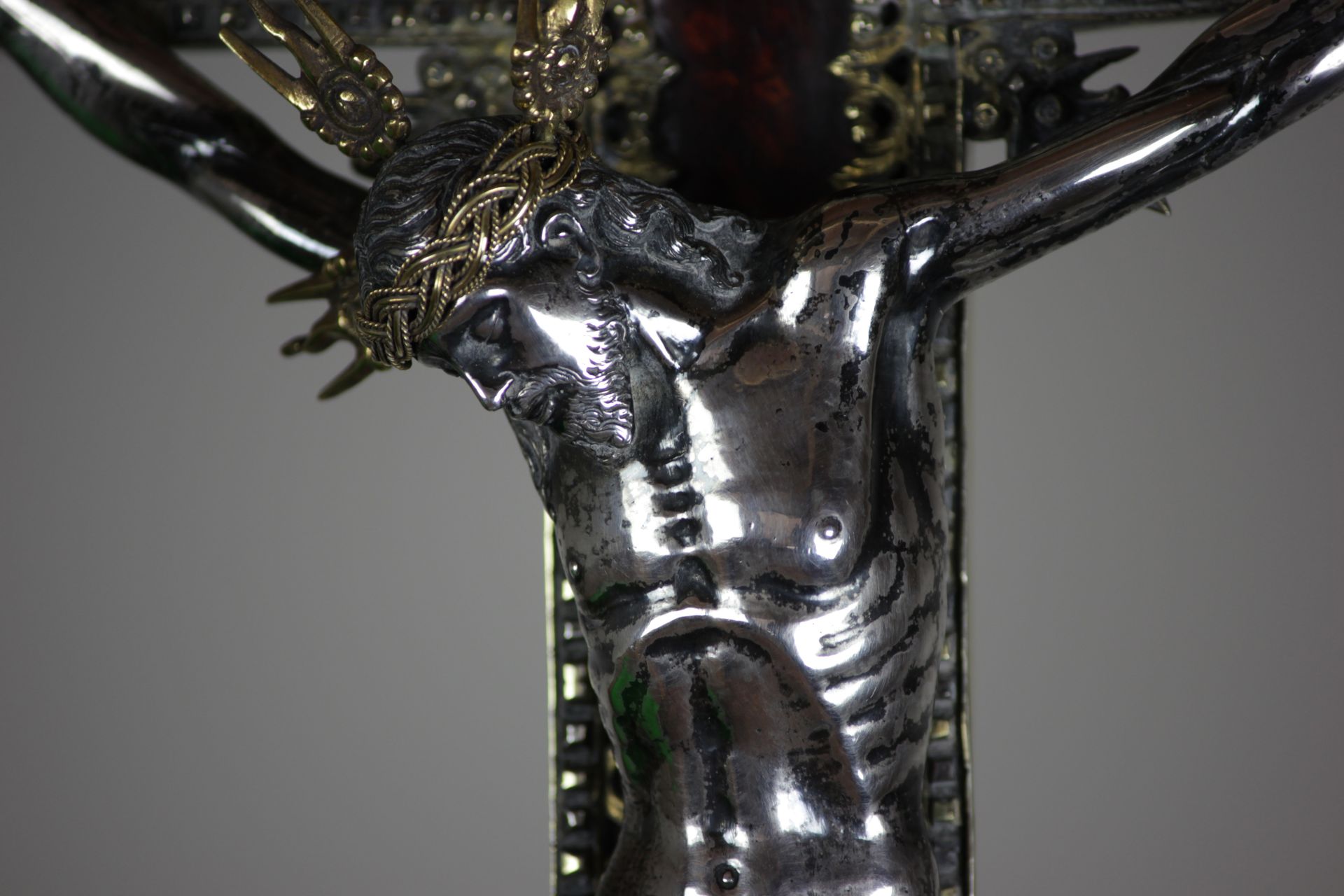 The exceptional craftsmanship of this remarkable Crucifix is characterised by its exquisitely carved details. The smallest elements of Christ's appearance, such as his hair curls, beard, open mouth, heavy eyelids, furrowed brow, veins, sinews, musculature, knuckles, joints, fingernails, toenails, the flowing folds of his perizonium (loincloth) and twisted 18 karat gold crown of thorns are rendered with the highest level of skill and quality.