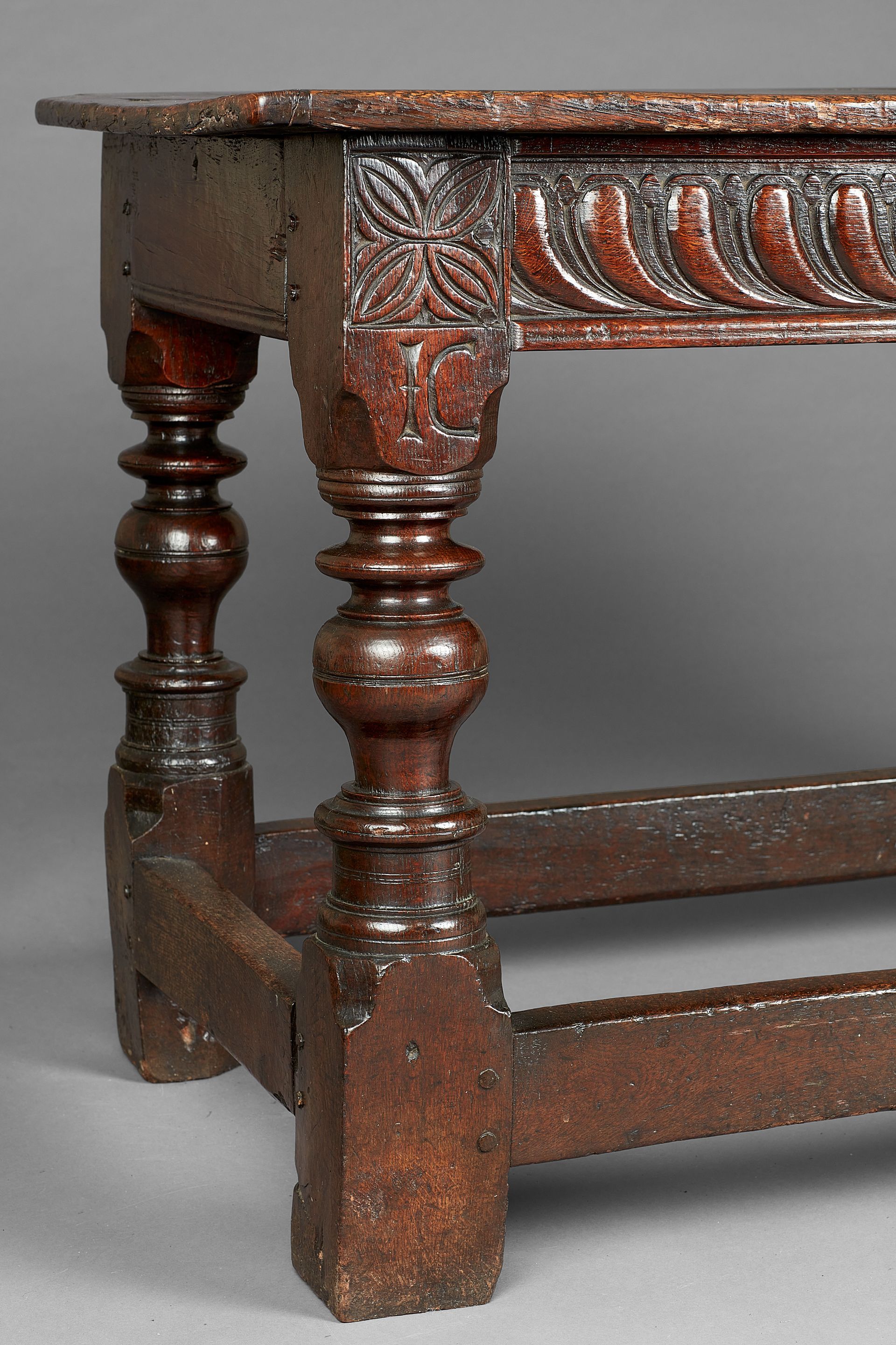 Having a triple-boarded end-cleated top, and a gadroon-carved frieze rail centred by a stylised flowerhead, on baluster over reel-turned legs, each upper front leg block carved with a petal-quatrefoil, atop the initials 'IC' to one and 'EC' to the other, joined by bold plain stretchers all round.